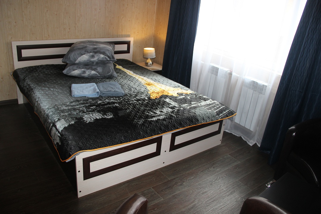 Комфортабельный номер «люкс», двухкомнатный, одна двуспальная кровать, односпальный диван, диван- книжка, дамский столик, ЖК — телевизор, ванная комната, стиральная машина, мини-кухня с посудой, чайником, микроволновой печью, холодильником, электроплиткой. Есть WI-FI